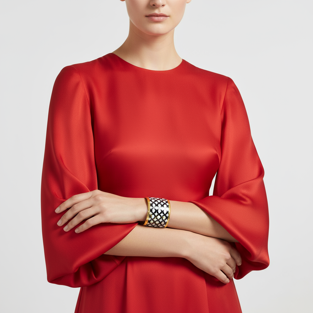 We applied the Rex motif to our much-loved “O” format necklace. Pair with a jewel-tone sleeveless sheath dress or your favorite jeans. Eye-catching and stylish.