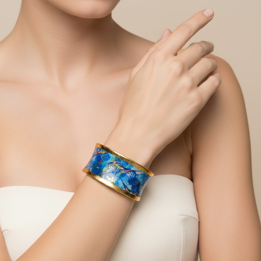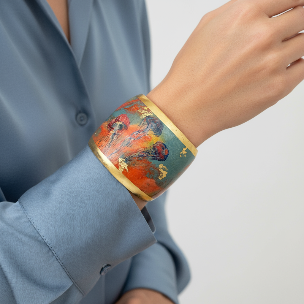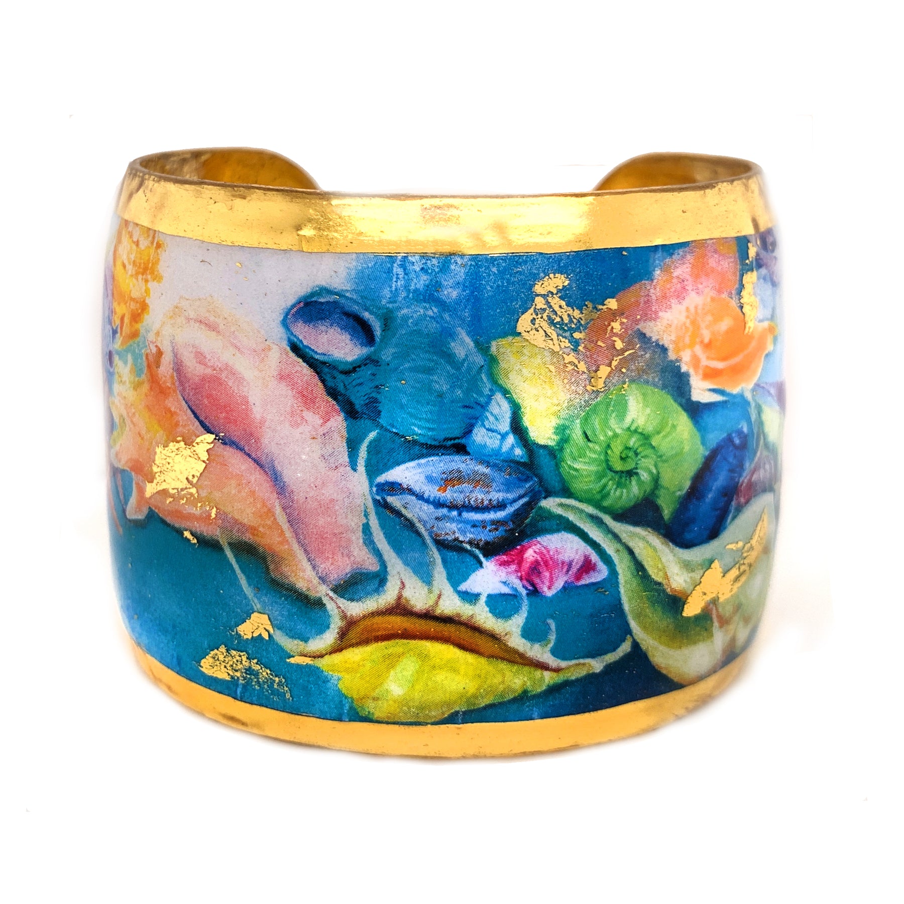 A colorful, tropical, wearable work of art, this cuff is gilded by hand with 22K gold leaf and features a rainbow of realistic seashells on an abstract ocean-blue background, sparkling with accents of 22K gold leaf.