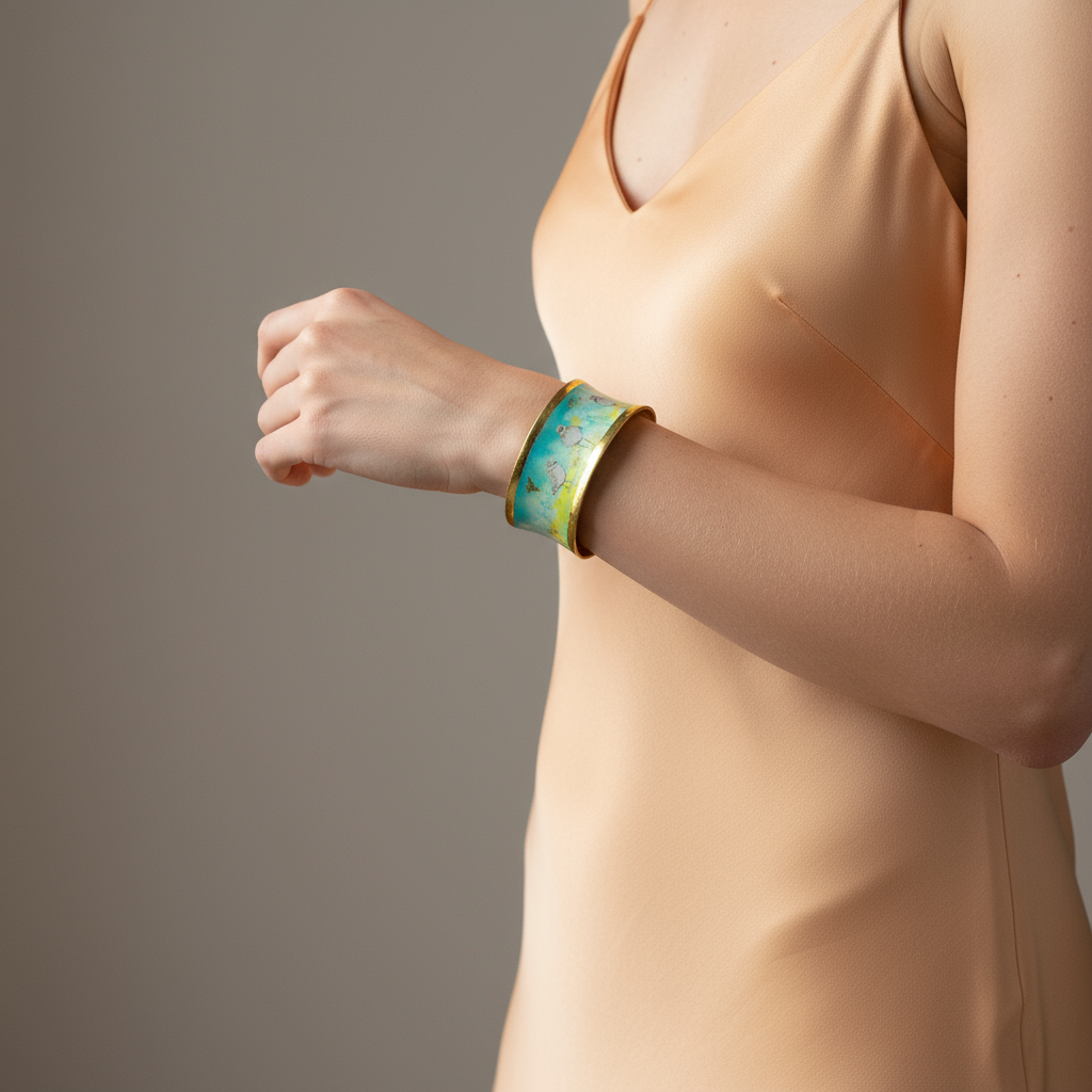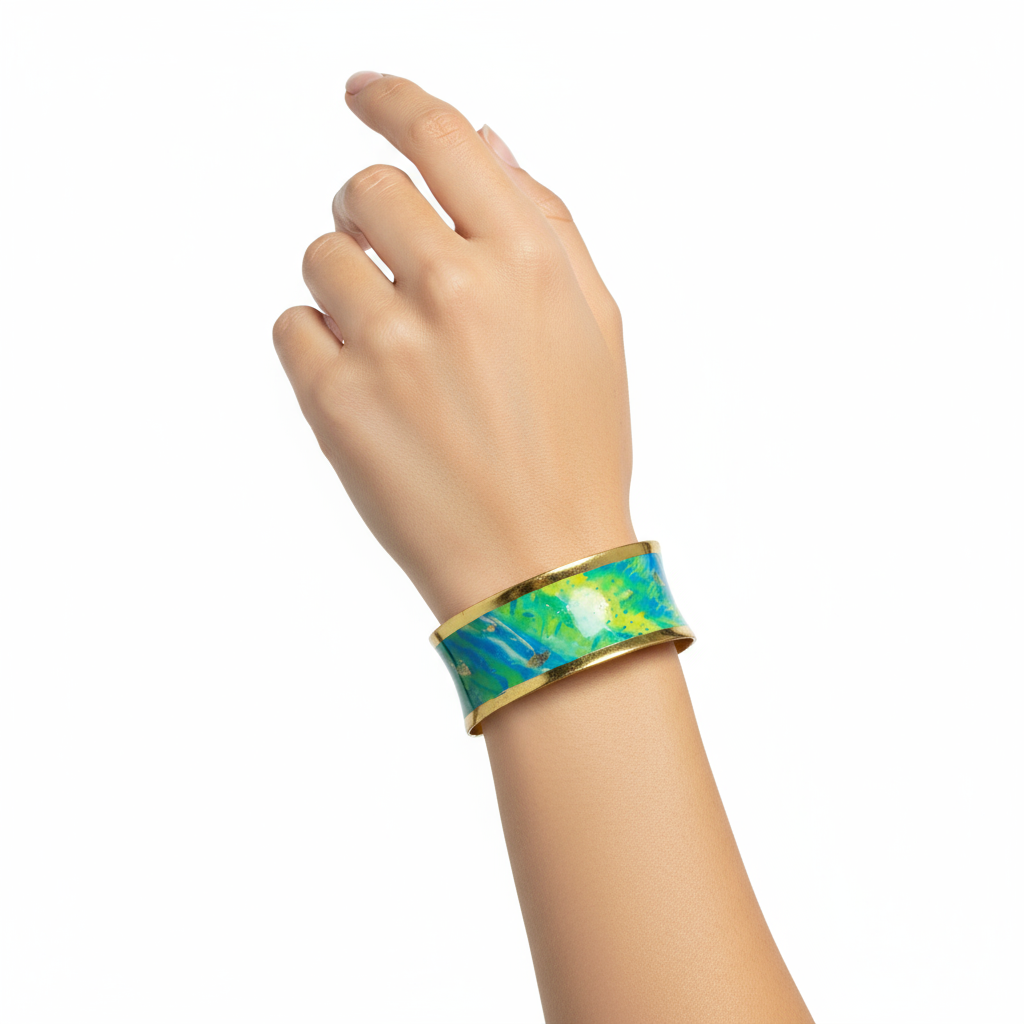 Her colorful coastal creations are modern blends of realistic flora and fauna adrift in abstract skies and waters, and in this exquisite new collection, ÉVOCATEUR has transformed some of Rachel’s favorite Florida-inspired paintings into wearable works of fine art shimmering with 22K gold leaf and sterling silver leaf.
